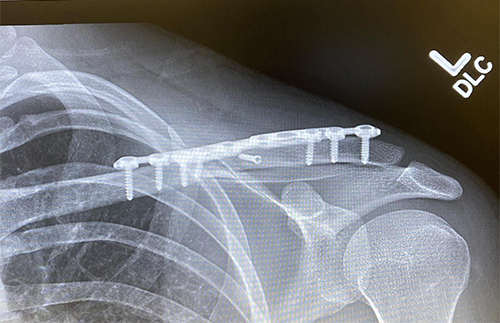 Clavicle, or "collar bone," fractures can happen from various mechanisms. They most commonly occur in the setting of motor vehicle and biking accidents or in a sports injury. They can occur when one falls onto an outstretched arm or gets direct contact to the shoulder area from the ground or another athlete. One typically feels a crack or pop with subsequent swelling in the area. It may be difficult to raise the arm after the injury due to pain. Figure 1 demonstrates a displaced clavicle fracture and Figure 2 demonstrates the clavicle after operative fixation with plate and screws.