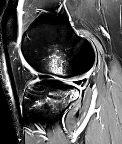 Subchondral knee fractures of the knee are also common occurrences with ligament injuries such as ACL tears. Oftentimes, with the pivot shift mechanism in an ACL rupture there is an anterior translation of the tibia relative to the femur. When this happens, there is frequently bone bruising also called subchondral fractures noted in the posterior lateral tibial plateau and anterior lateral femoral condyles. MRIs will show these lesions in the acute period. This is often referred to as kissing contusions (Figure 2).