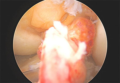 In select patients, one may elect to proceed with a primary repair of the torn ACL with a minimally invasive arthroscopic procedure to repair the ligament. When an ACL is repaired, the surgeon places sutures in the remaining ACL stump and fixates this suture back towards the bone from which the ACL should attach to. Typically, this procedure is considered for patients with a more proximal (femoral or “thigh” bone) avulsion tear (the ligament is pulled away from the bone) with a good quality ligament stump still attached to the tibia. Figure 1 demonstrates placement of sutures in an ACL that was found to be approximately 80% intact with the proximal 20% wall attachment compromised. This tear was repaired and tensioned with sutures as shown in Figure 2. A biologic that can help the ACL heal includes bovine collagen via the BEAR procedure (Bridge Enhanced ACL Repair). A blood clot is inserted surrounding the ACL to facilitate its healing. Benefits of ACL repair include smaller incisions, avoidance of donor site morbidity and thus preserved strength, maintained proprioception or balance fibers in the ACL, and less arthritis. Dr. Momaya was the first orthopedic surgeon in the state of Alabama to repair a torn ACL repair with the novel BEAR procedure. However, ACL repair failure rates do remain unsatisfactory in those who are higher demand athletes and younger aged patients when compared to ACL reconstruction (Cruz, 2023).